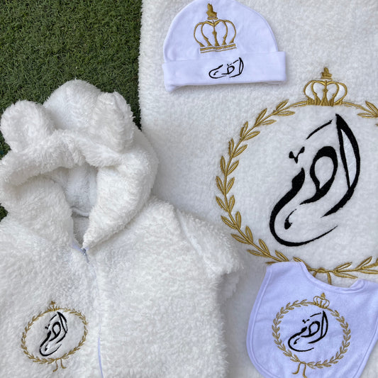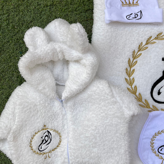 Personalized 4-Piece Winter Baby Set – Jumpsuit, Blanket, Hat & Bib